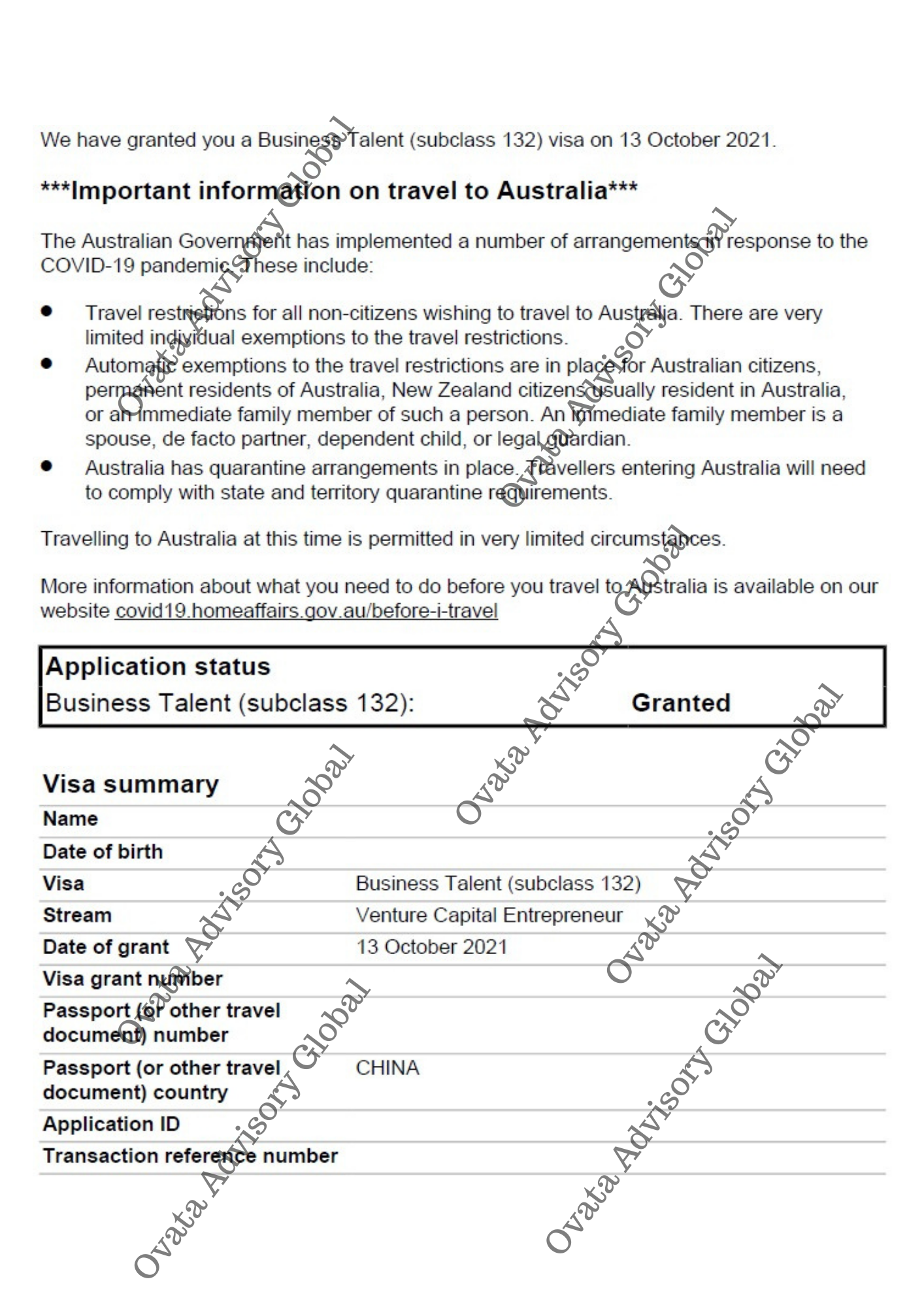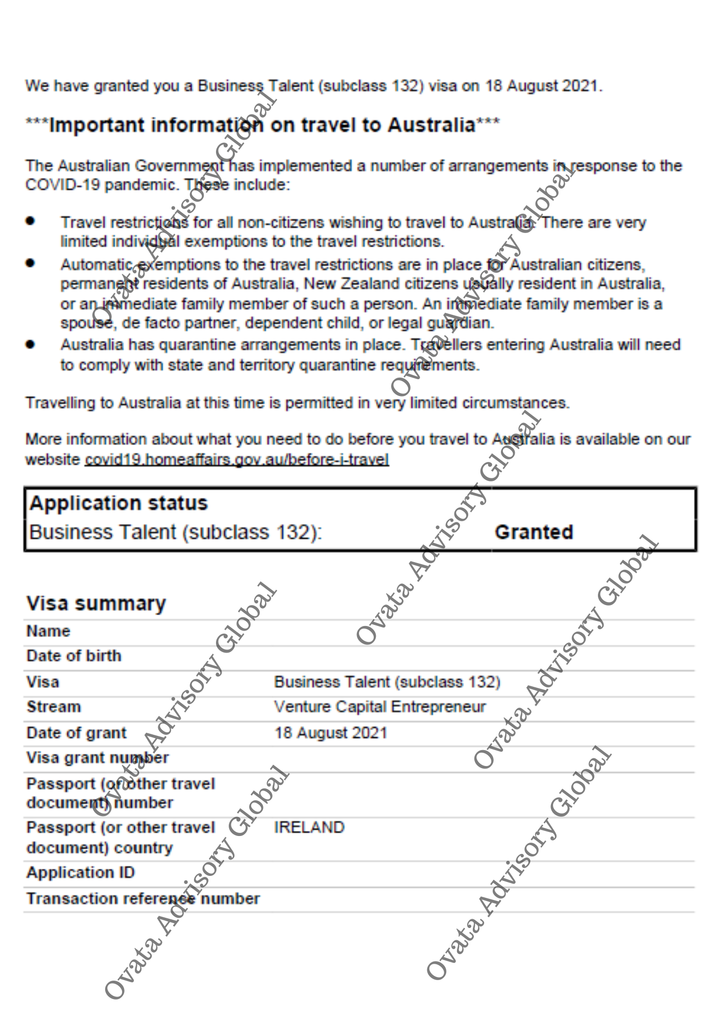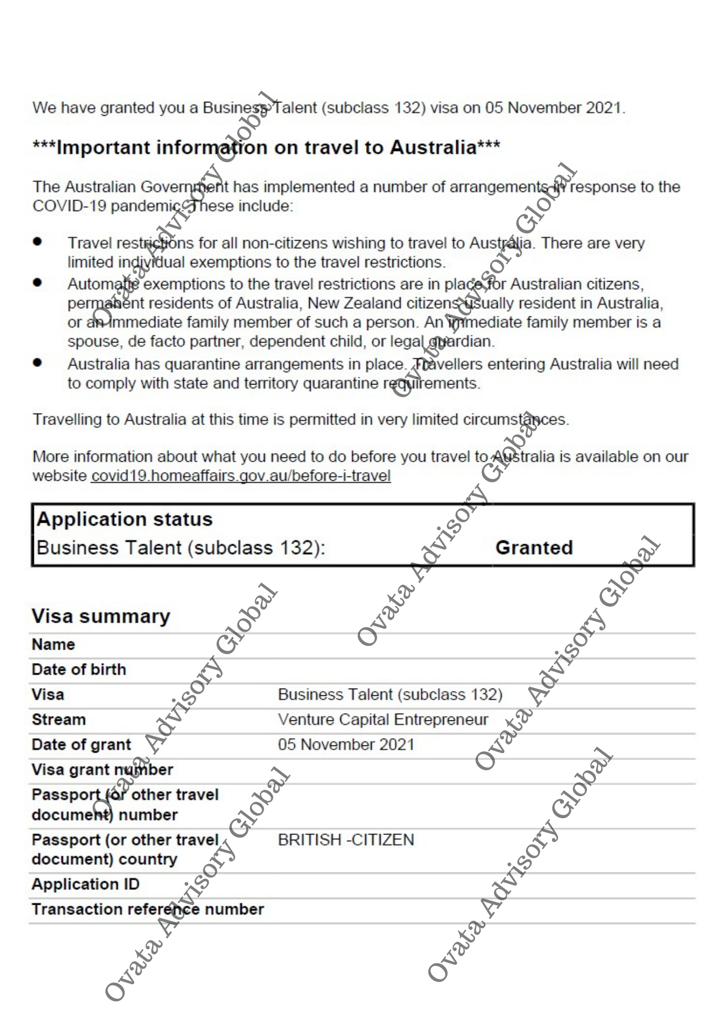 Ovata Advisory Global provides corporate advisory services. We are not registered with MARA and are not affiliated with any government immigration department. All immigration advice is provided directly by our partner lawyers who are qualified to offer immigration assistance.